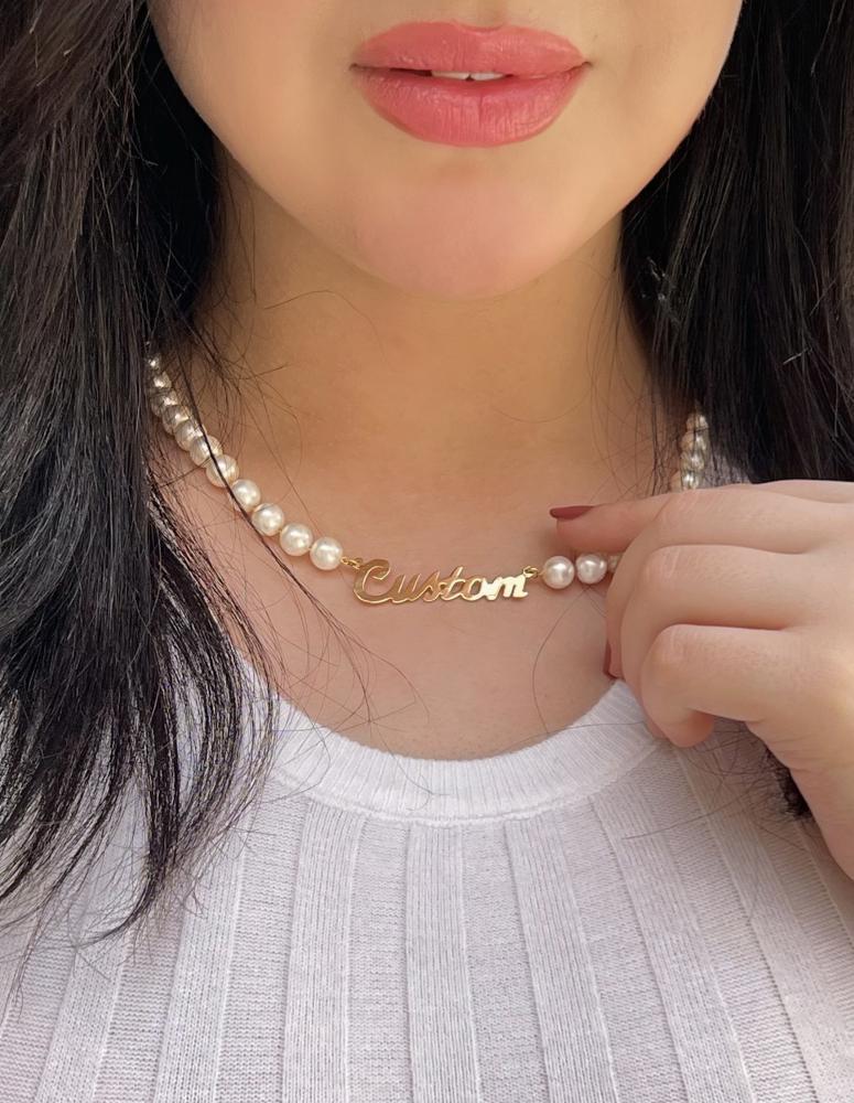 تميزي بارتداء سلسال من اللؤلؤ الصناعي يحمل اسمك بشكل منحوت مطلي بالذهب أو الفضة