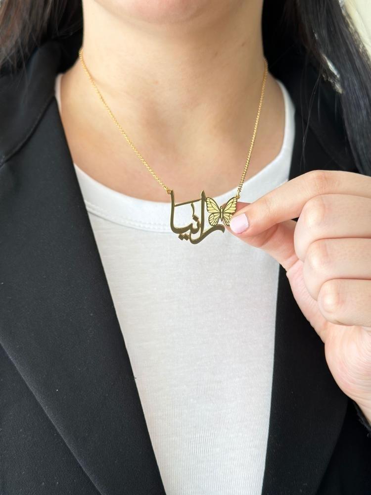 ارتقي بإطلالتك مع قلادة تنبض بالحياة! تصميم يجمع بين نعومة الفراشة وجمال اسمك في قطعة واحدة مصممة خصيصًا لك.