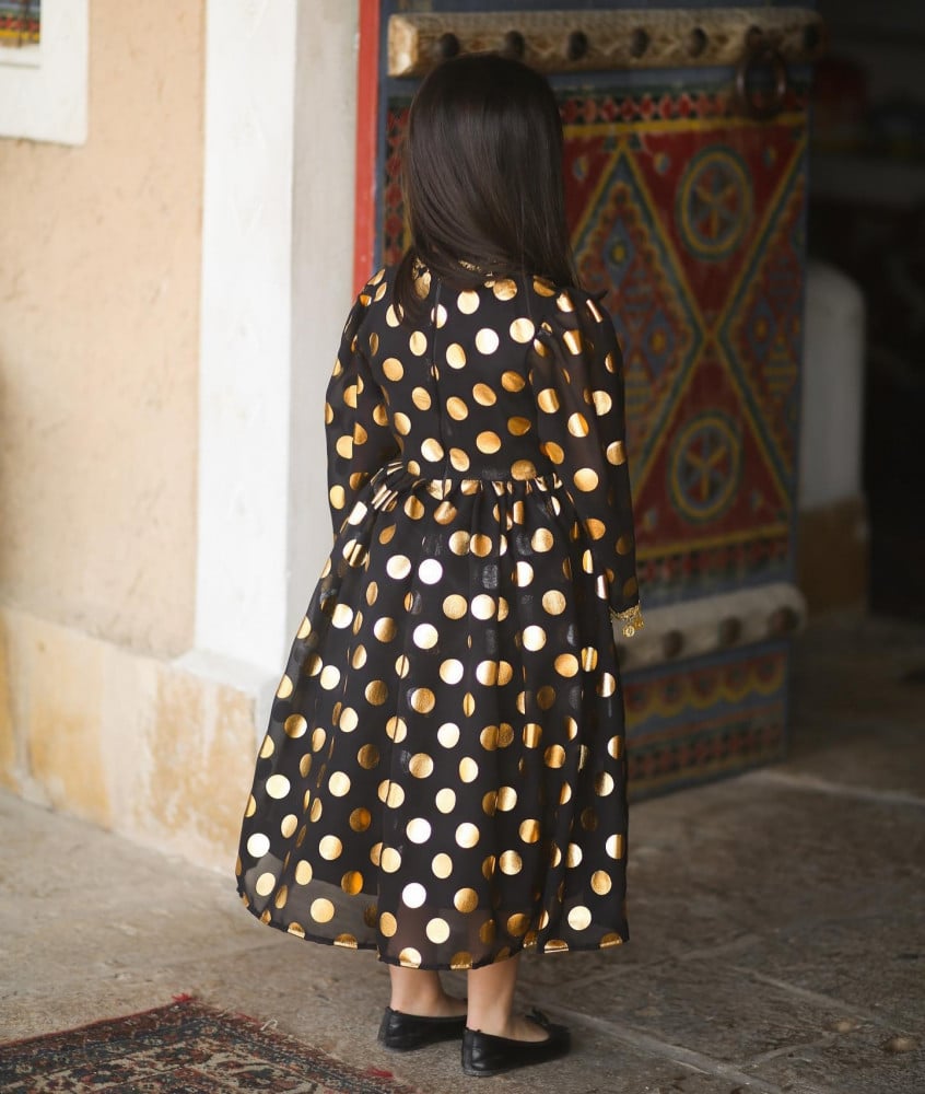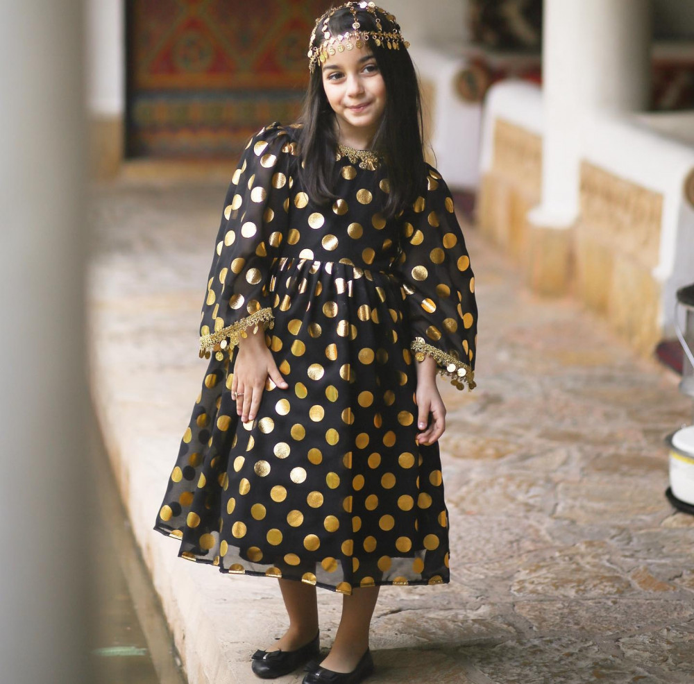 احتفلي بيوم التأسيس بإطلالة مستوحاة من التراث الأصيل مع هذا الفستان الفاخر والمميز للبنات. يأتي الفستان بلون أسود أنيق مزين بنقوش دائرية ذهبية تضفي لمسة من الفخامة والتألق، مع قصّة كلاسيكية واسعة وأكمام طويلة تضيف رونقاً ملكياً راقياً. تطريز الأكمام الذهبي مع الإكسسوار التقليدي للرأس يكمل الإطلالة التراثية المبهرة. مثالي ليوم التأسيس والمناسبات الوطنية، حيث يجمع بين الجمال، الهوية، والفخر بالتراث السعودي.
