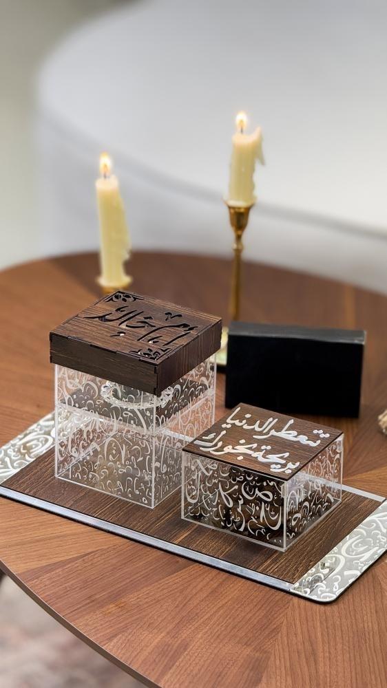 طقم مبخرة خشبي ، يحتوي على مبخرة مصممه بالاحرف العربيه على الجوانب ، علبة بخور ، وصحن أنيق مع احرف عربيه على الجوانب. مثالي لإضفاء أجواء هادئة وجميلة في منزلك أو مكتبك، ويعد خيارًا رائعًا للهدايا الفاخرة.