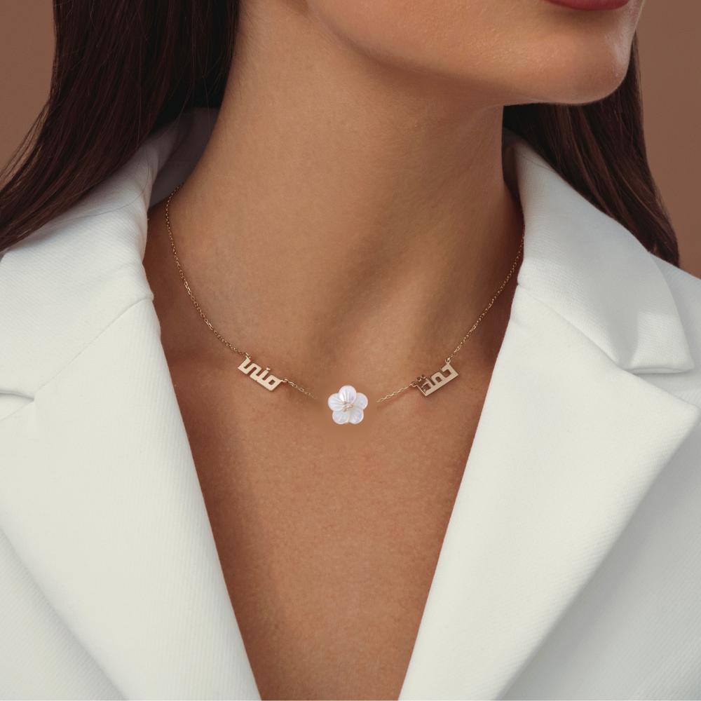ارتدي أناقتك الخاصة مع قلادة مصممة باسمين تختارينهما، تتوسطها وردة زركون متألقة تضيف لمسة من الفخامة والجاذبية.