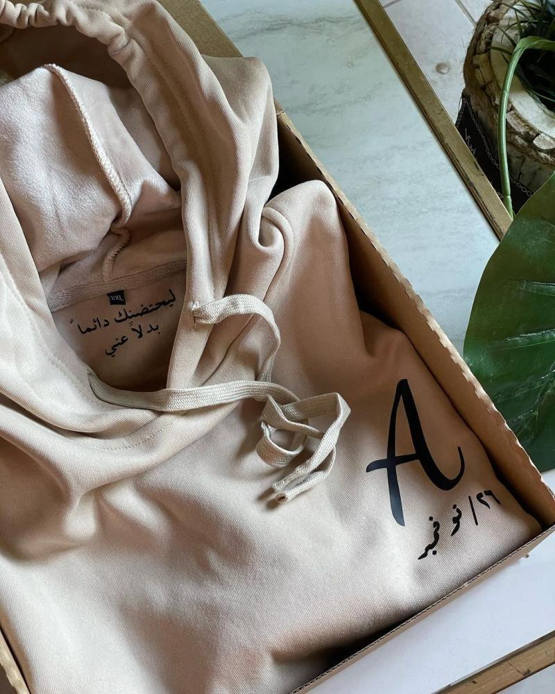 خلّك دايم دافي وأنيق مع هودي 'ليحتضنك دائمًا بدل عني' – تصميم فريد يناسب الجنسين. مصنوع من أفخم الخامات وبداخله رسالة دافئة تقول: 'ليحتضنك دائمًا بدل عني'، كأنك تاخذ حضن دافي معك وين ما تروح. اختر لونك المفضل من الرصاصي، الأسود، الأبيض، أو البيج، واستمتع بتغليف مميز مجاني وكرت برسالة منك. كما يمكنك تغيير الحرف والتاريخ على الهودي، بالإضافة إلى الرسالة الداخلية، حسب طلبك لتجعله الهدية المثالية لشخص غالي عليك.
